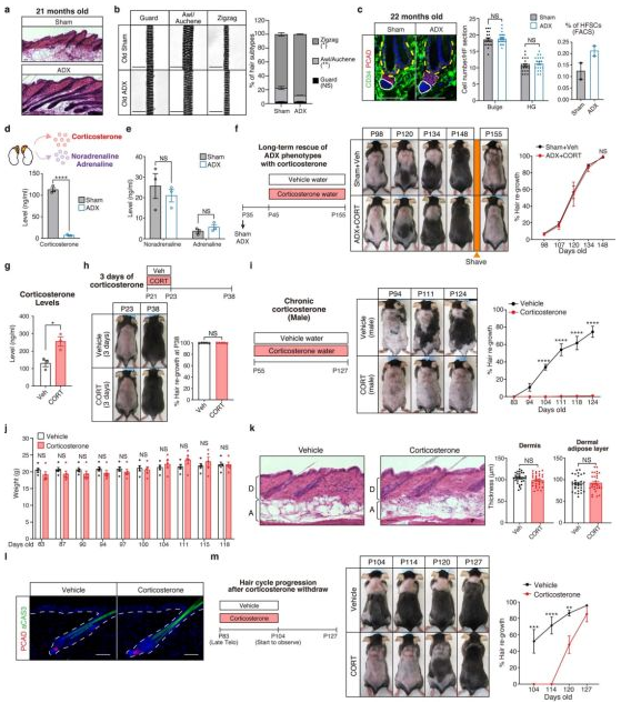为了进一步验证他们的猜想,在部分手术组小鼠中喂食皮质酮(肾上腺产生的一种应激激素),发现可以抑制这种过于频繁的毛发生长周期并恢复正常;同时,在九周中持续给部分正常组小鼠施加各种压力,检测到皮质酮的含量显著升高,并且毛发生长持续减少。