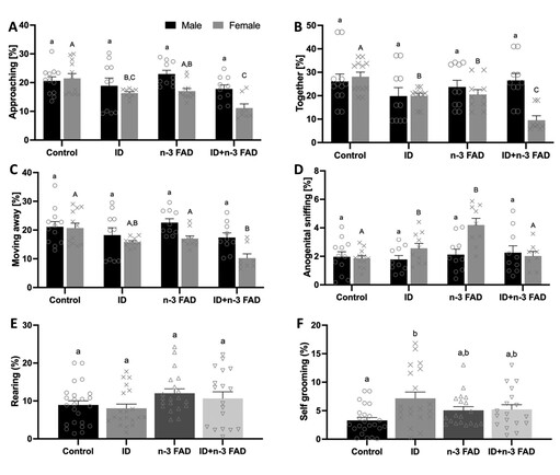 这项对大鼠的研究表明,铁和n-3 FAD,单独和组合,在早期生活中引起行为缺陷,特别是快感缺乏,焦虑和社会功能障碍,这可能是由皮质纹状体神经递质浓度的变化引起的。此外,铁和n-3 FAD可能会以性别特异性方式增加异常社会行为的风险。因此,文章中研究结果表明,早期生活中的饮食缺乏都可能与神经精神表现的病因有关,尤其是当联合存在时。未来的研究是必要的,以确定铁和n-3 FAD对社会行为的性别特异性影响的机制,以及在神经发育的关键时期引入铁和n-3 FA后,在早期发育期间诱导的铁和n-3 FAD的影响是否是可逆的。