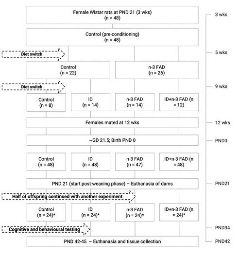文章实验流程图(来源于<<Iron and n-3 fatty acid depletion, alone and in combination, during early development provoke neurochemical changes, anhedonia, anxiety and social dysfunction in rats>>)